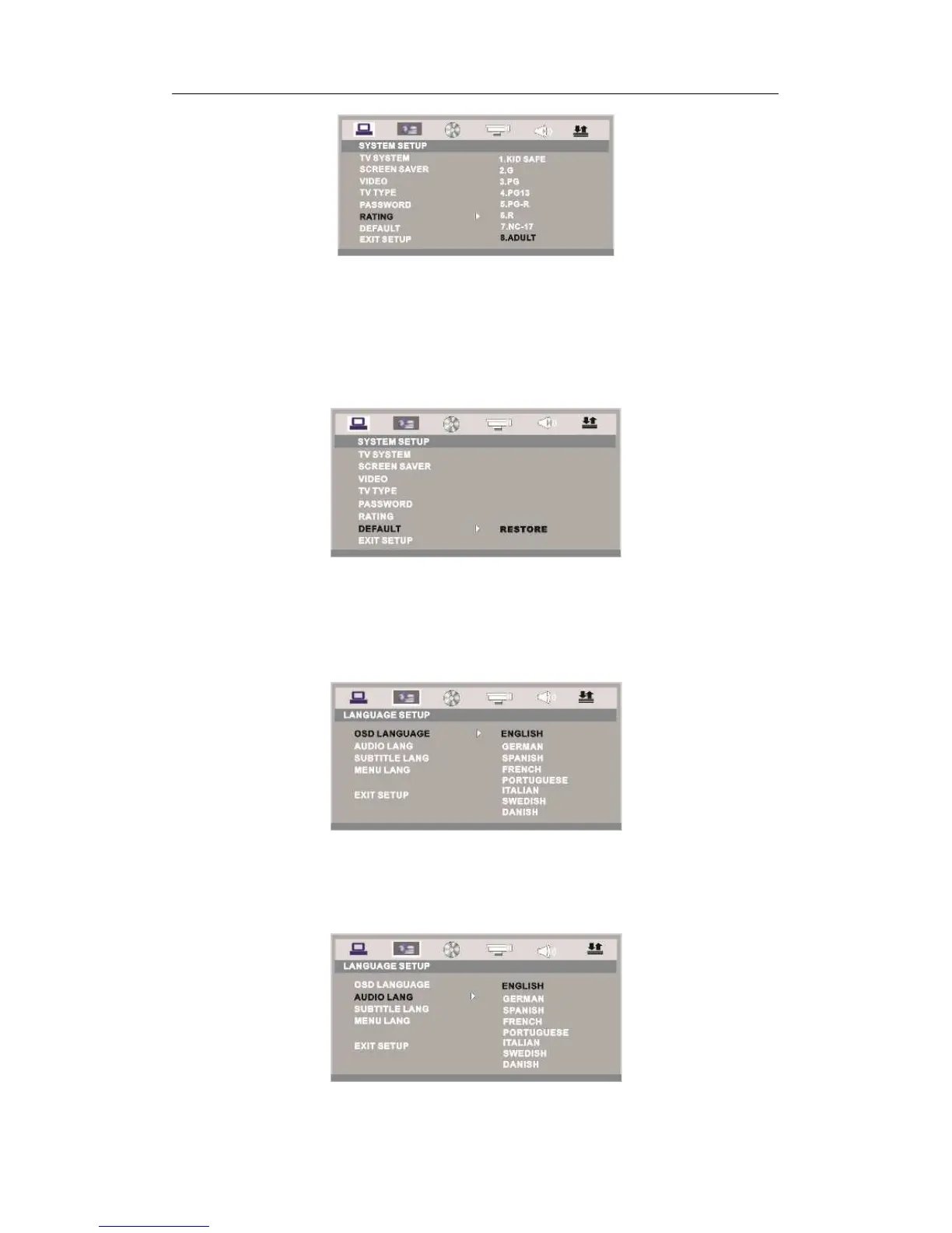 Highlight the AUDIO LANG option, and press the Arrow buttons to choose the audio