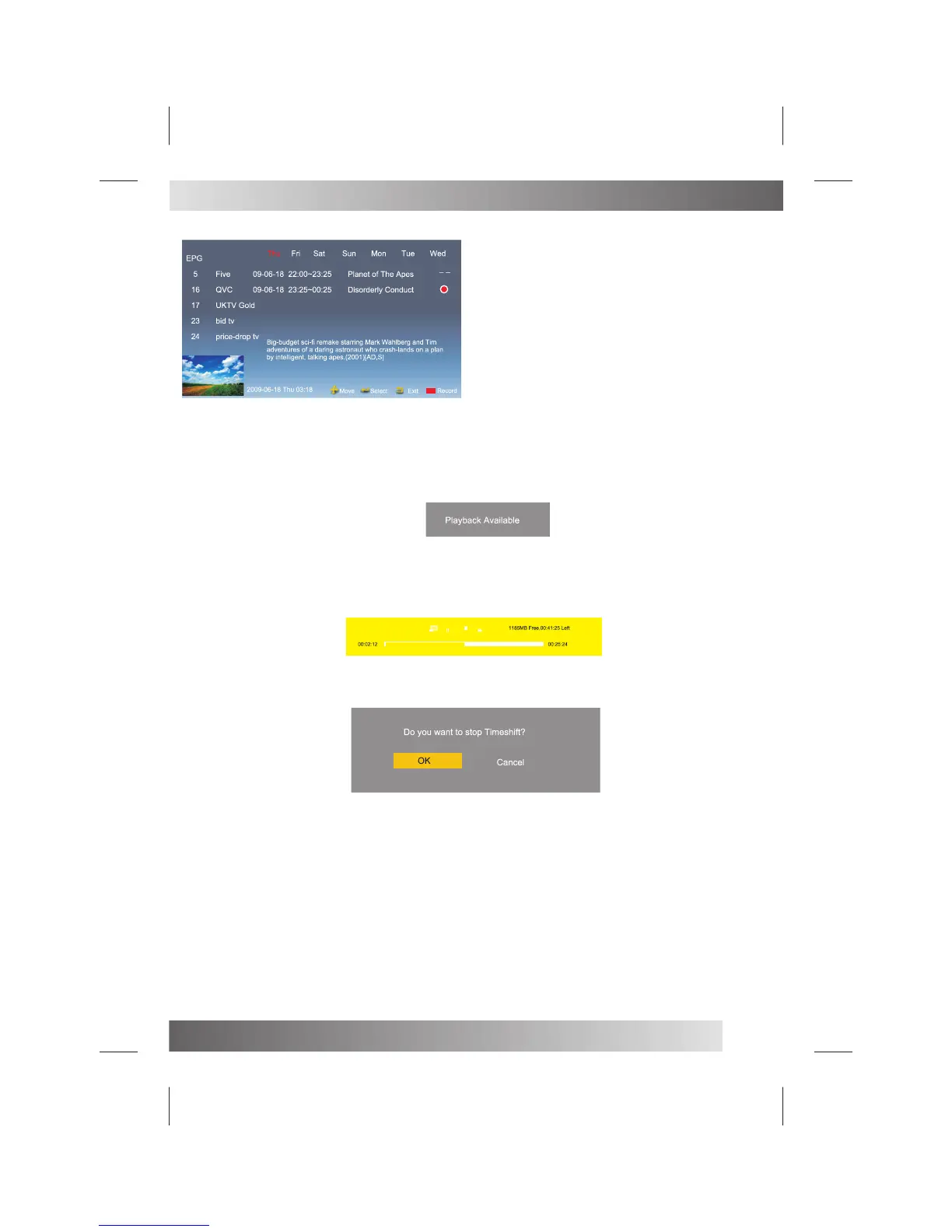 Note: During Timeshift, you can not callout Input Source, Menu, Text, EPG, MHEG ,FAV List