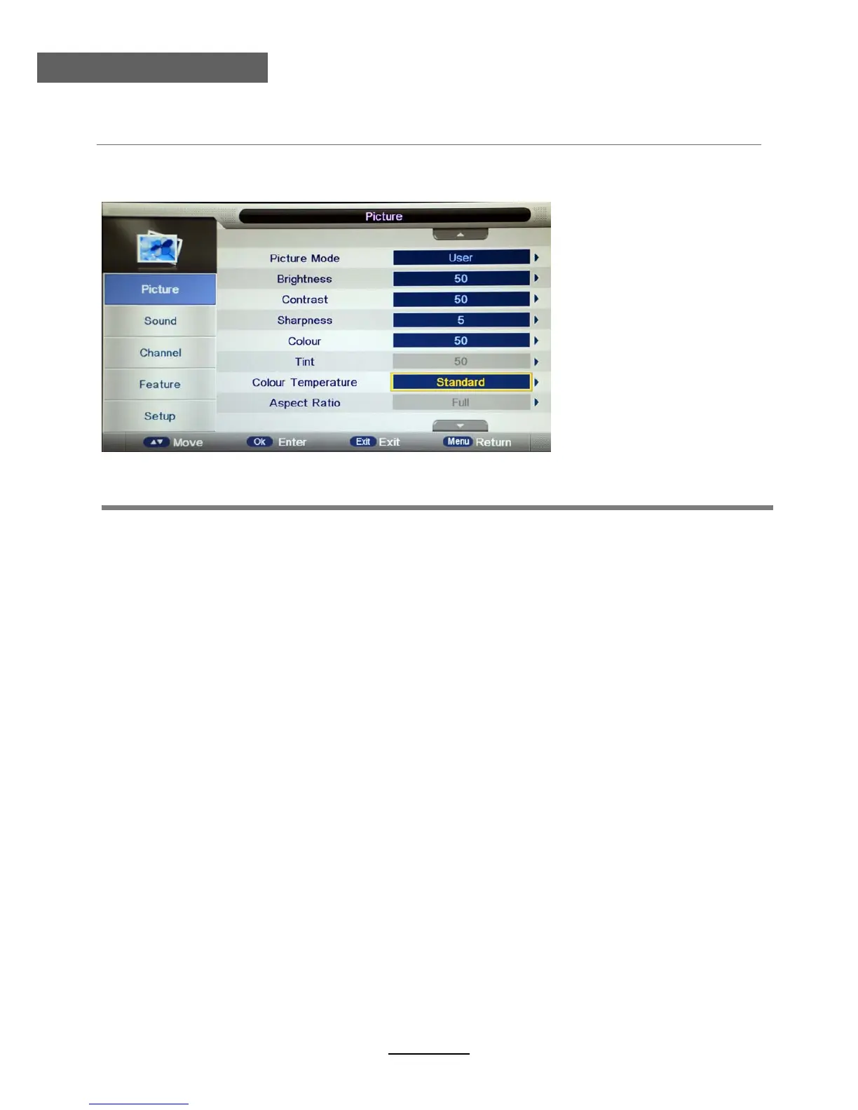 Picture Mode: Select your desired picture mode from Dynamic, Standard, Mild and User.