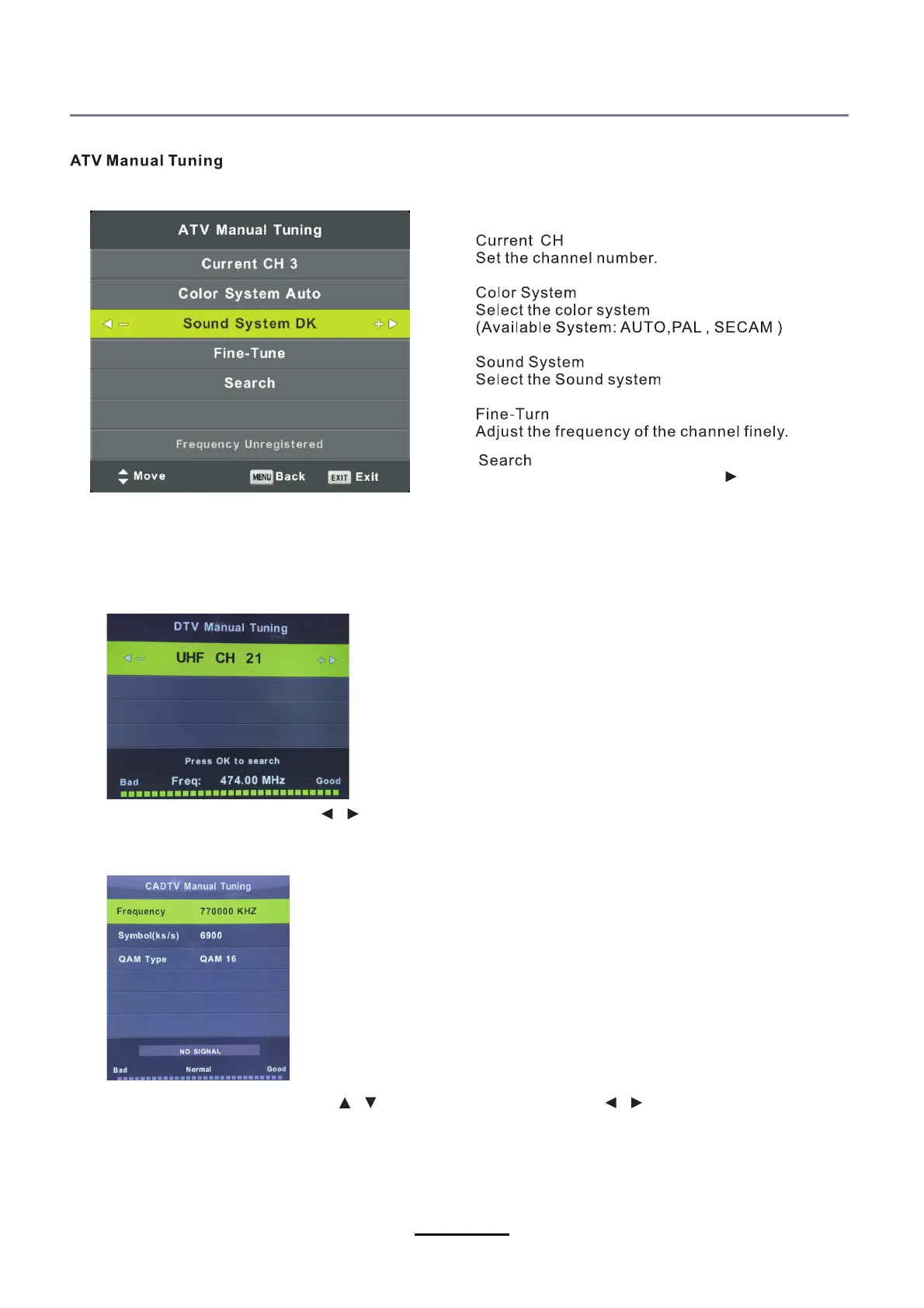 Enter the CADTV Manual Tuning. Press / button to select the item and press / button to adjust the