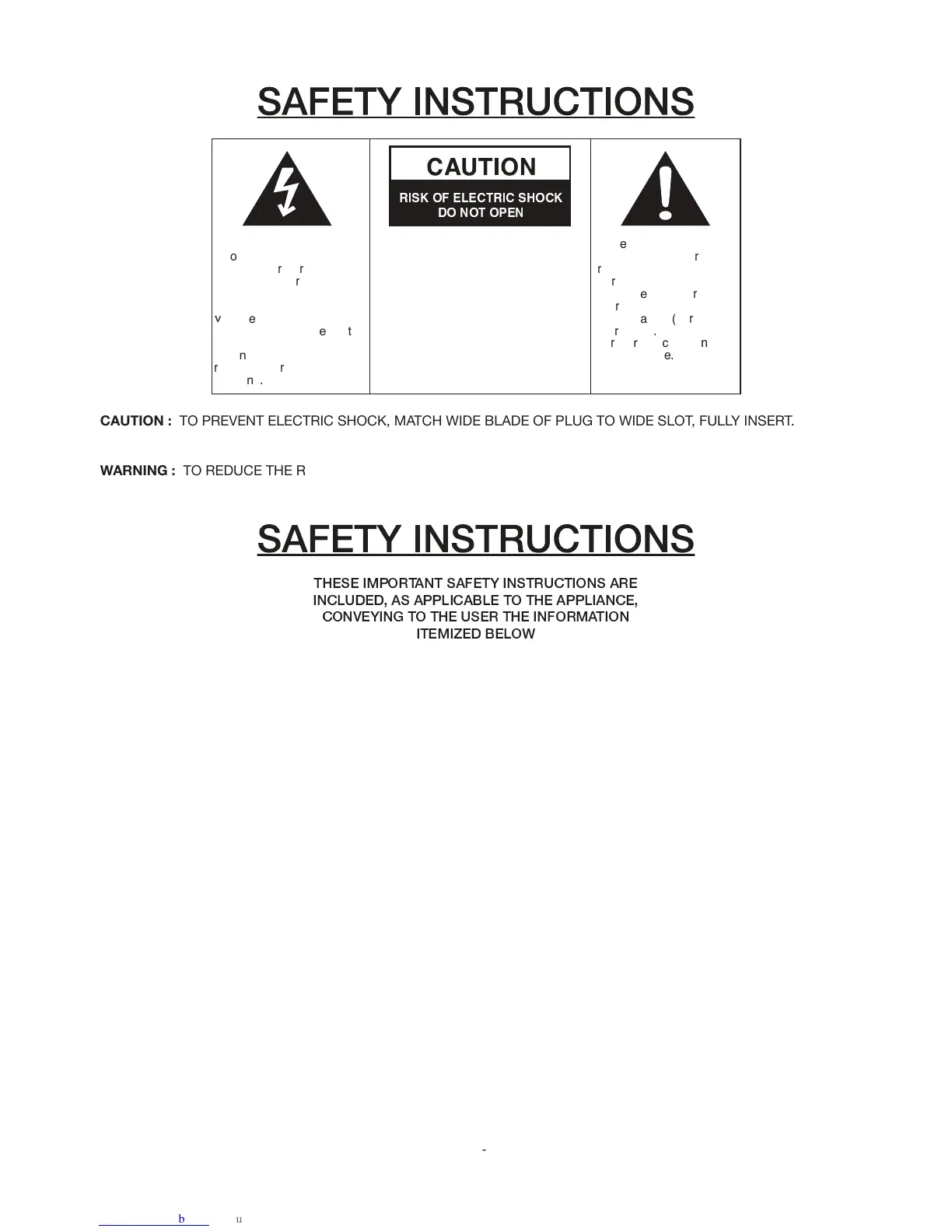 CAUTION : TO PREVENT ELECTRIC SHOCK, MATCH WIDE BLADE OF PLUG TO WIDE SLOT, FULLY INSERT.