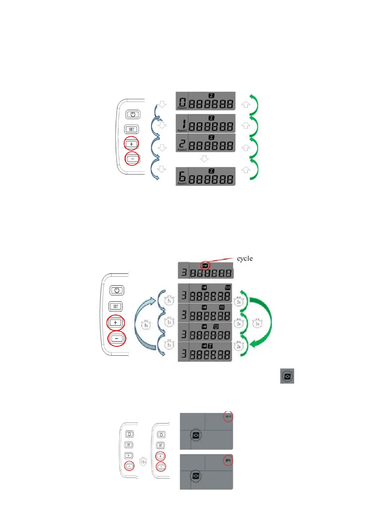 premere “+” o “-” per scegliere l’unità di misura della velocità in KM/H o M/H per visualizzarli sul display LCD (Fig.