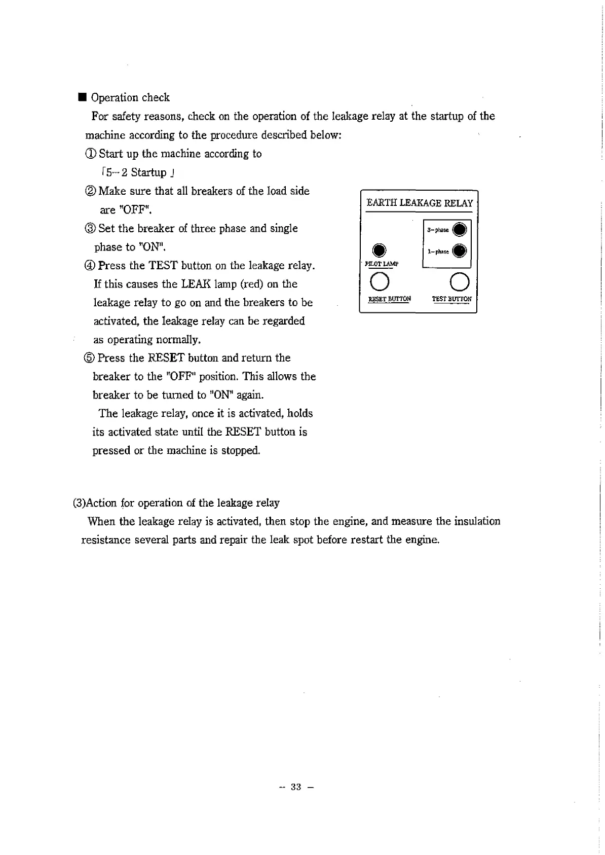 For safety reasons, check on the operation of the leakage relay at the startup of the