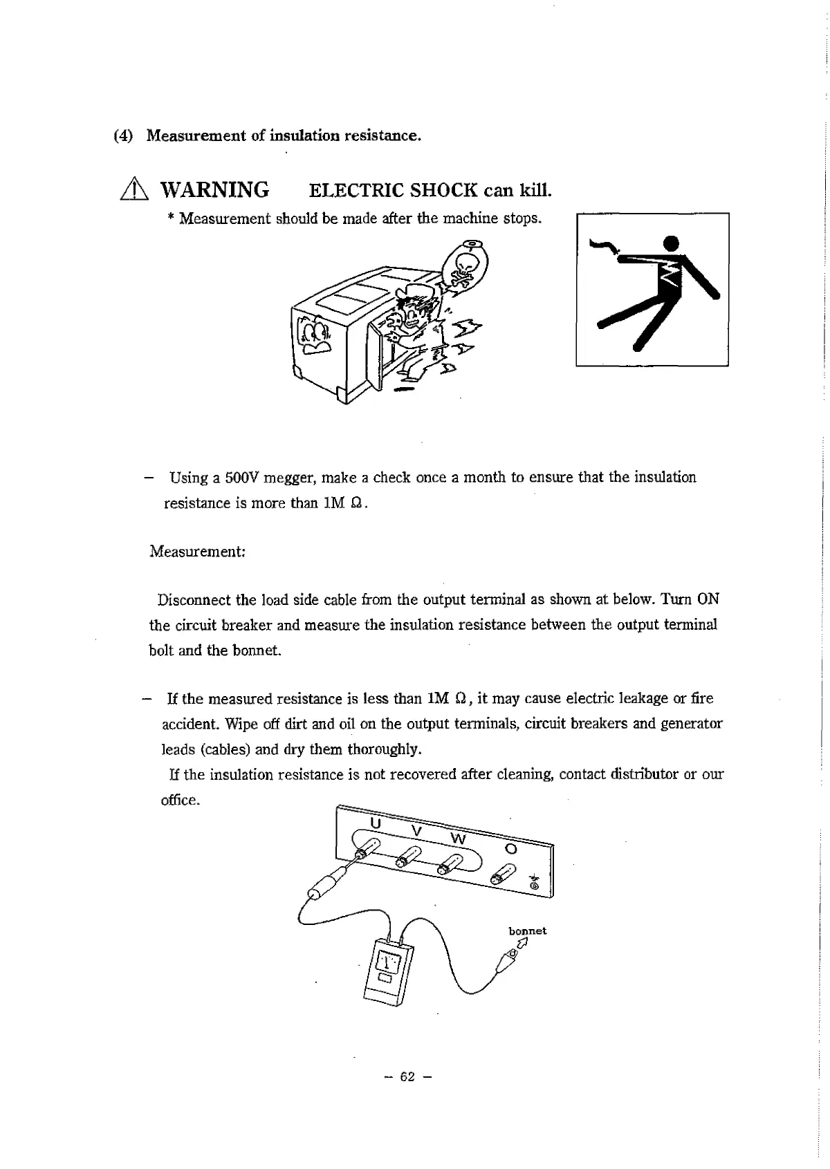 - Using a 500V megger, make a check once a month to ensure that the insulation