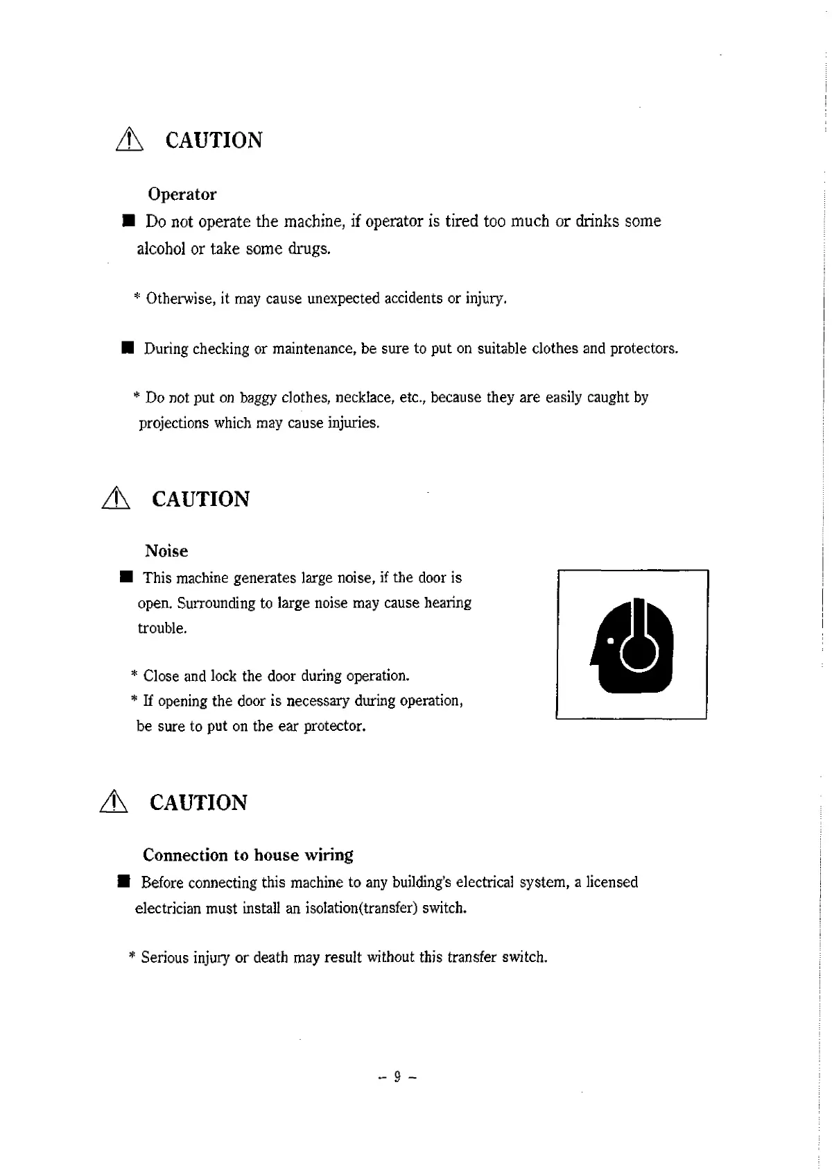 ■ Do not operate the machine, if operator is tired too much or drinks some
