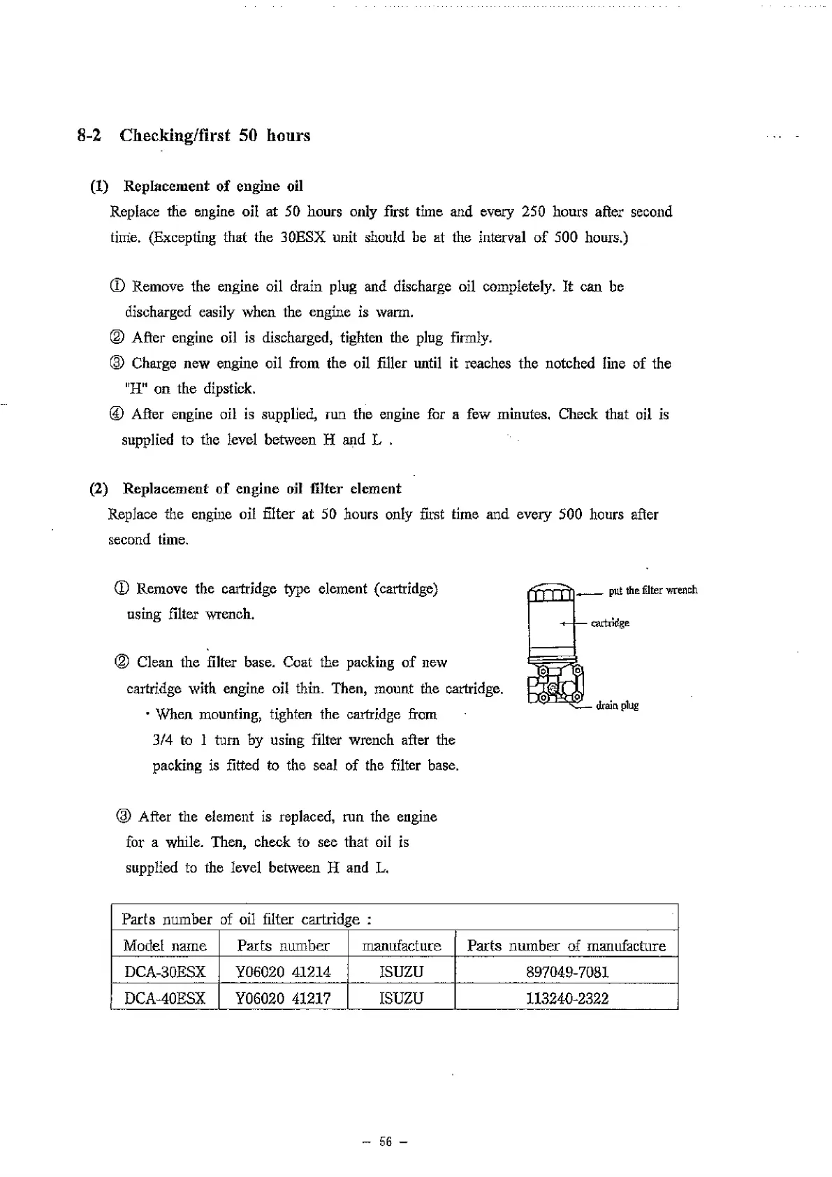 Replace the engine oil filter at 50 hours only first time and every 500 hours after