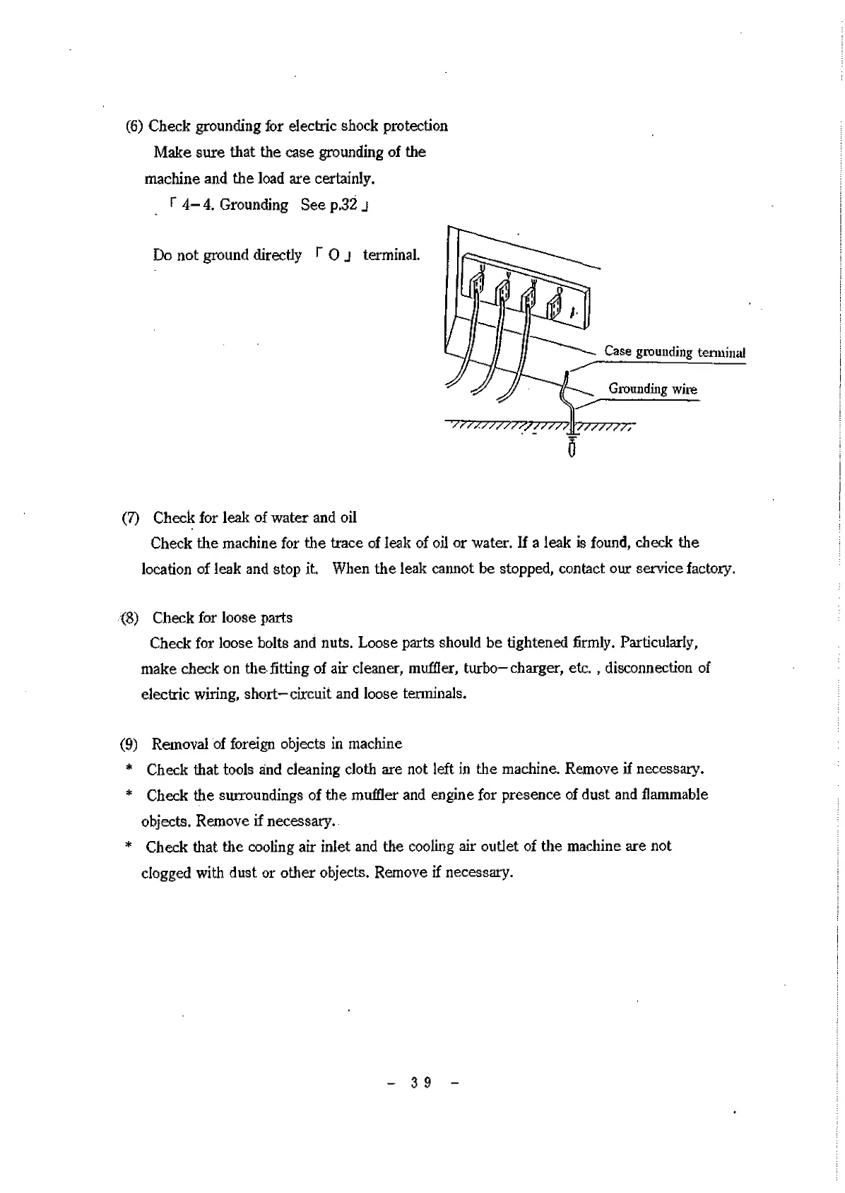 Check for loose bolts and nuts. Loose parts should be tightened firmly. Particularly,