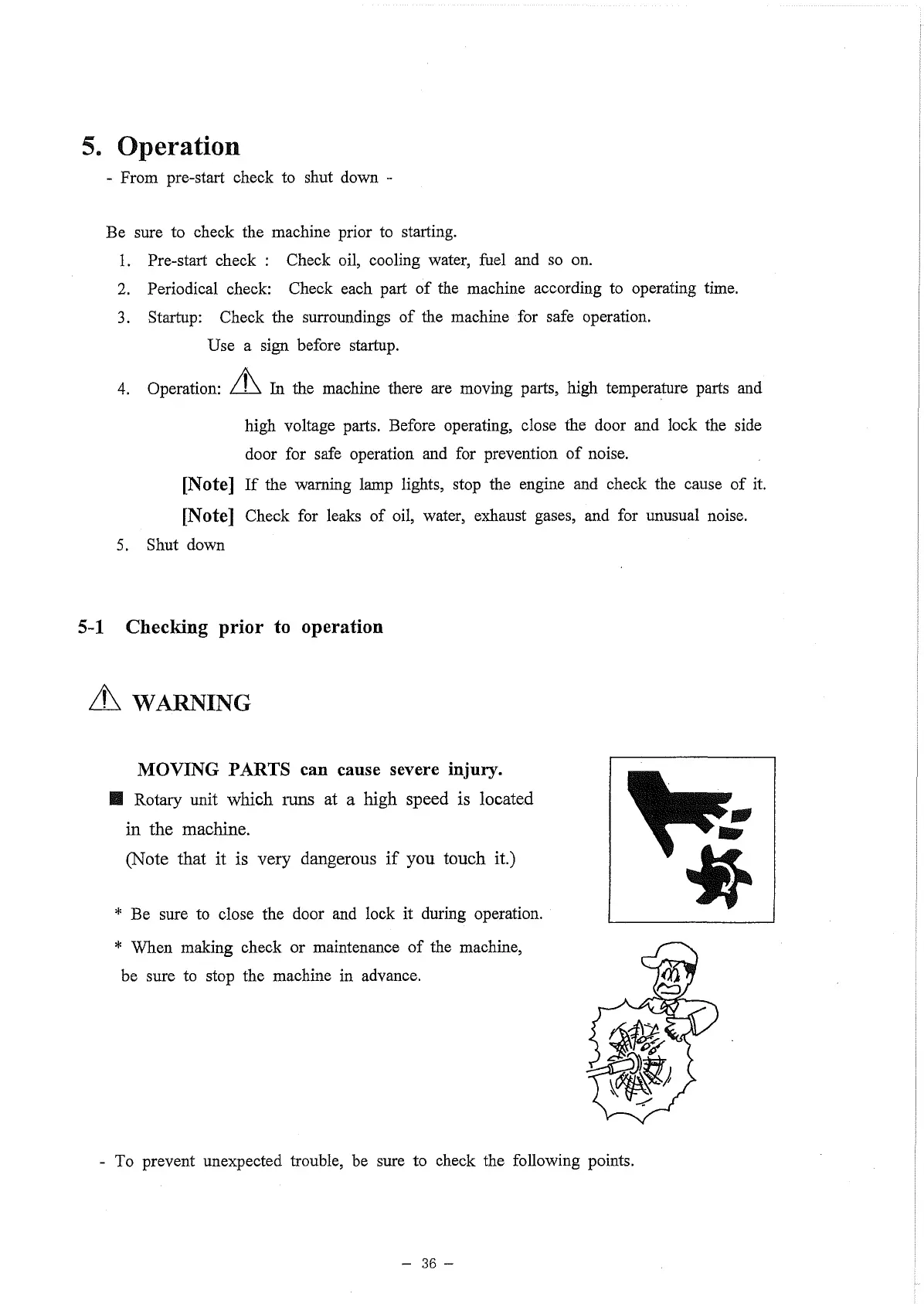 1. Pre-start check : Check oil, cooling water, fuel and so on.