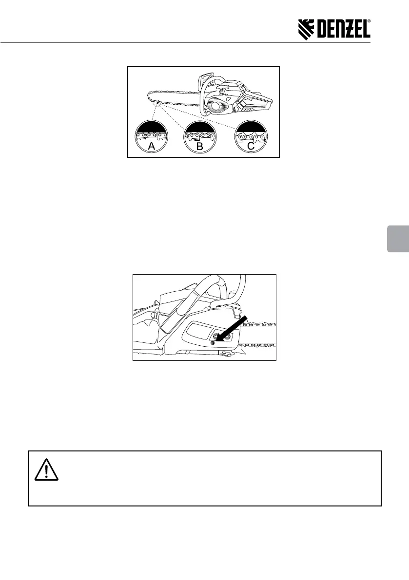 di regolazione (D) in senso orario per stringere la catena. Per ridurre la tensione della catena ruotate