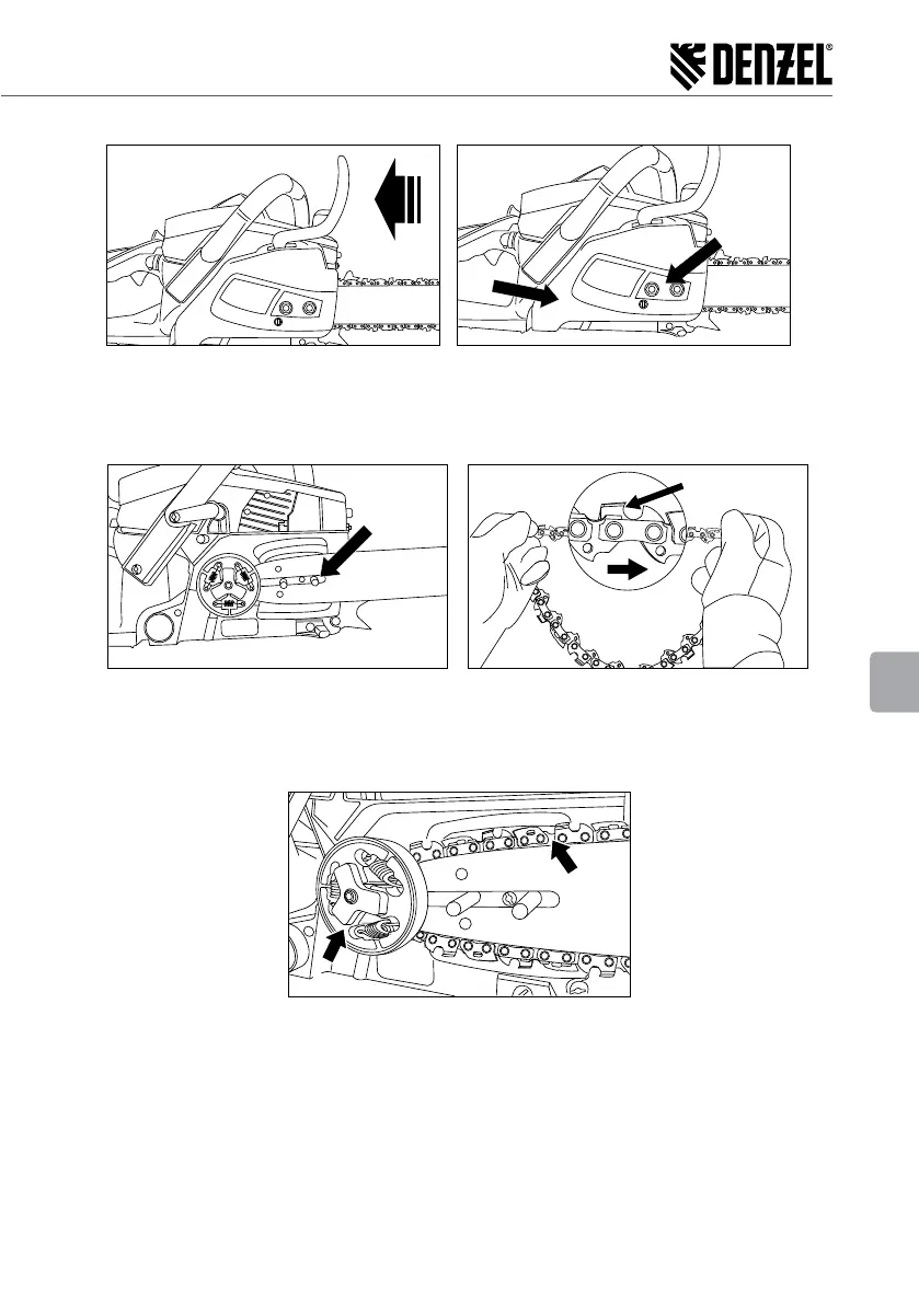 5. Așezai lanul cu marginile ascuite (D) îndreptate conform indicatorilor pe capacul de protecie și pe șina