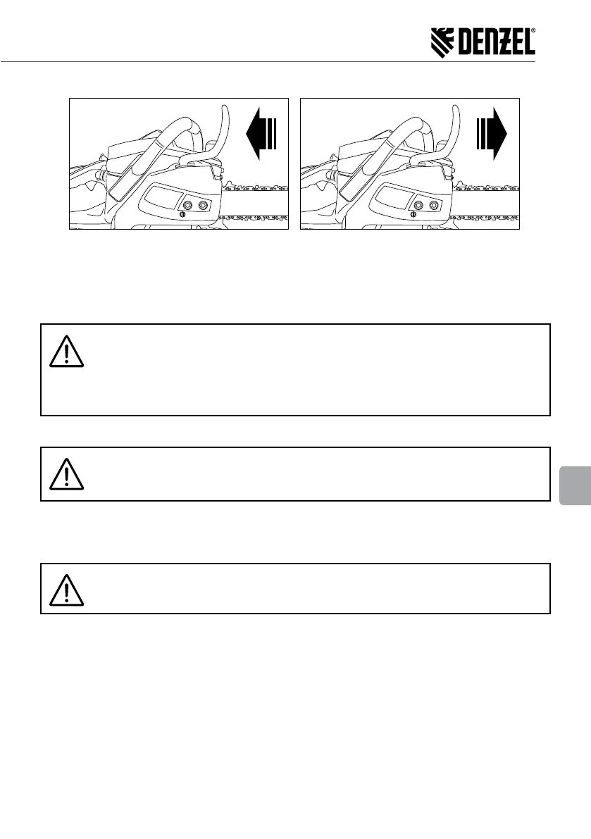 3. Naciśnij osłonę hamulca łańcucha. Łańcuch powinien szybko zatrzymać się. Zwolnij dźwignię gazu.
