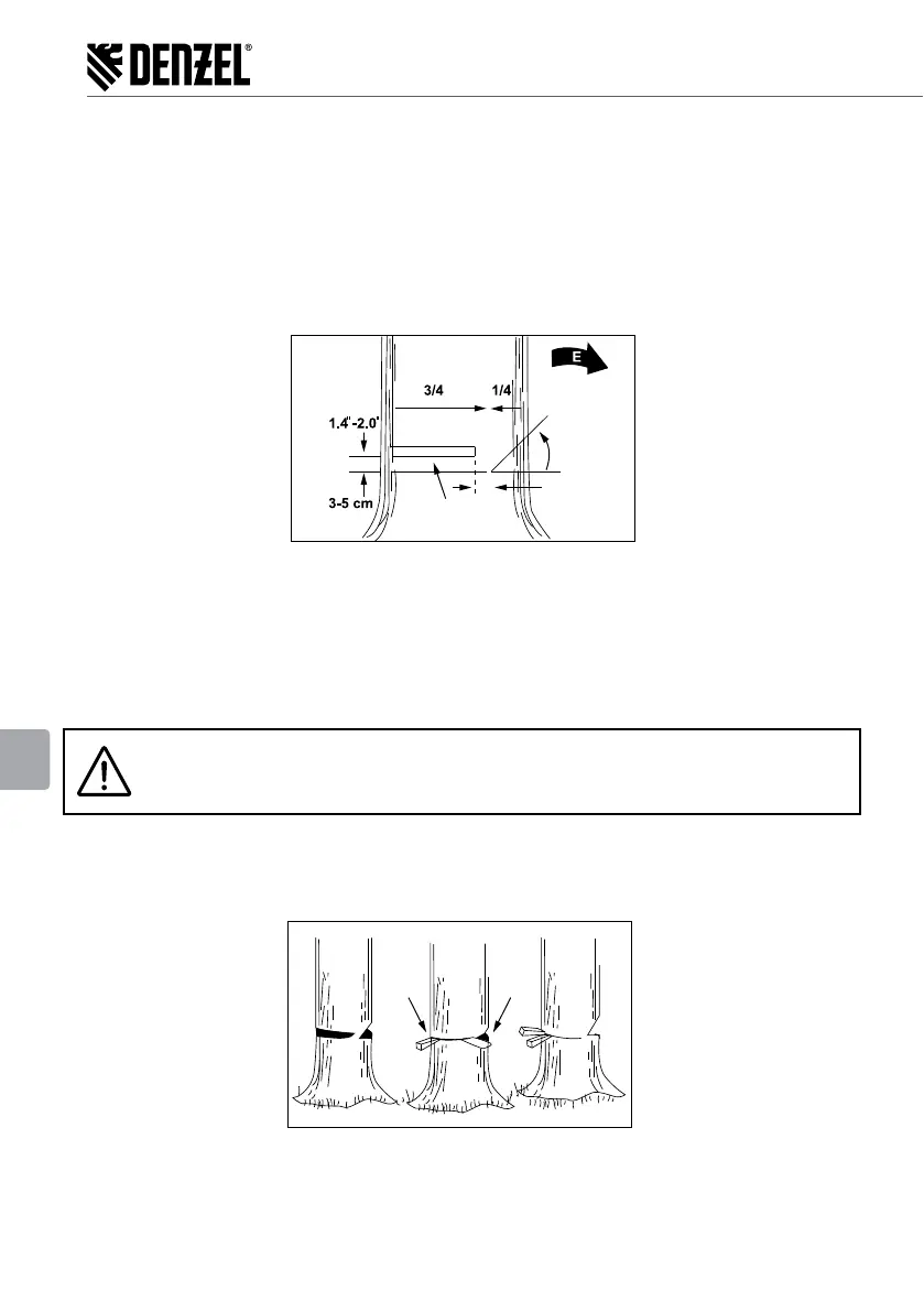 Uwaga! Nie idź przed drzewem, na którym już wykonano nacięcia. Końcowe cięcie (D) wykonuje się z tyłu