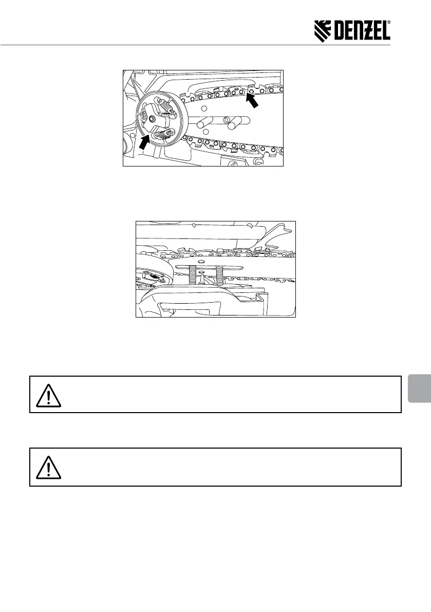 8. Otáčením řetězu se ujistěte, že zuby řetězu zapadají do zubů řetězového kola.