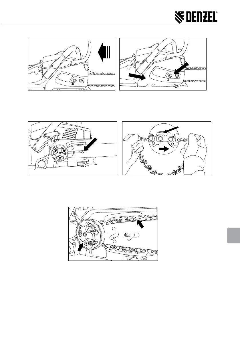 6. Helyezze a láncot a hajtókerék mögé (Е). Ellenőrizze, hogy a láncszemek jól vannak e elhelyezve