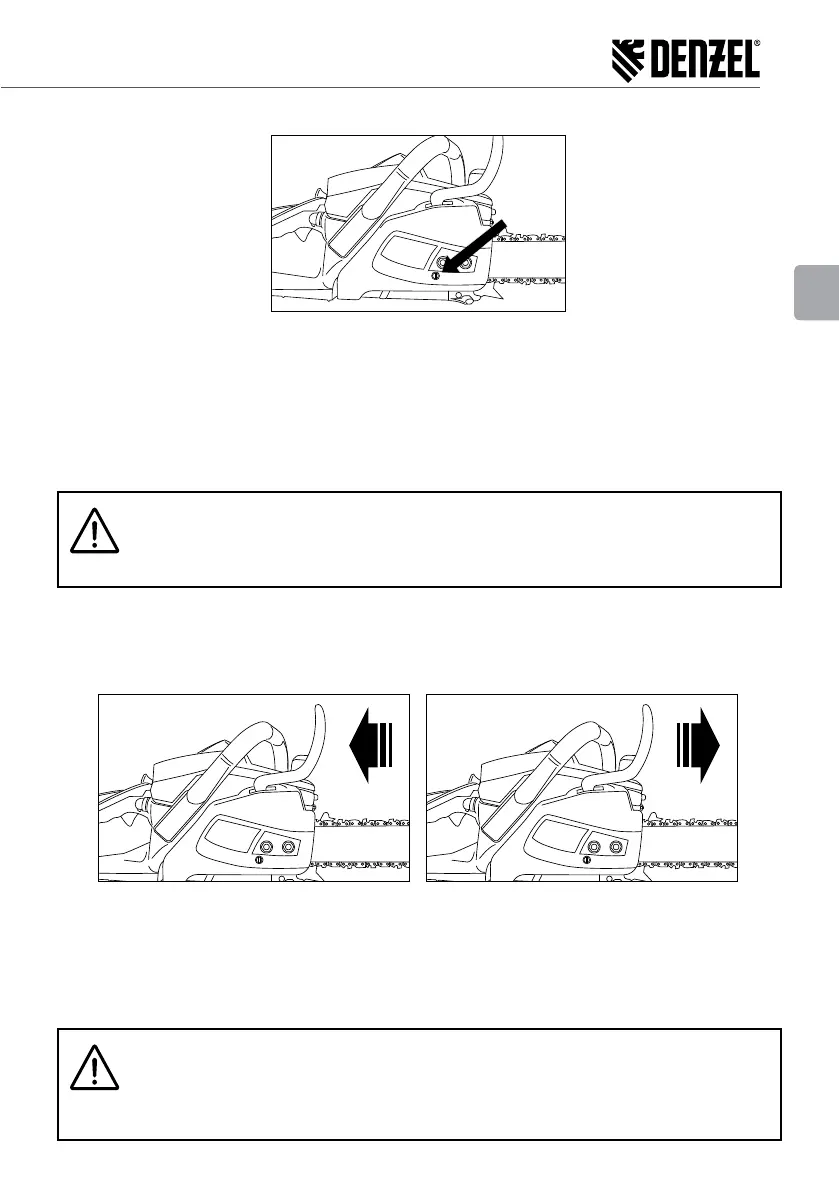 3. Appuyez sur la protection du frein de chaîne. La chaîne doit s'arrêter rapidement. Relâchez la touche