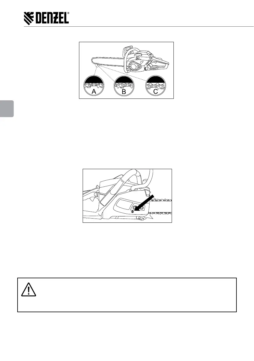 drehen Sie die Regelschraube (D) in dem Uhrzeigersinn, um die Kette zu spannen. Um die Spannung der