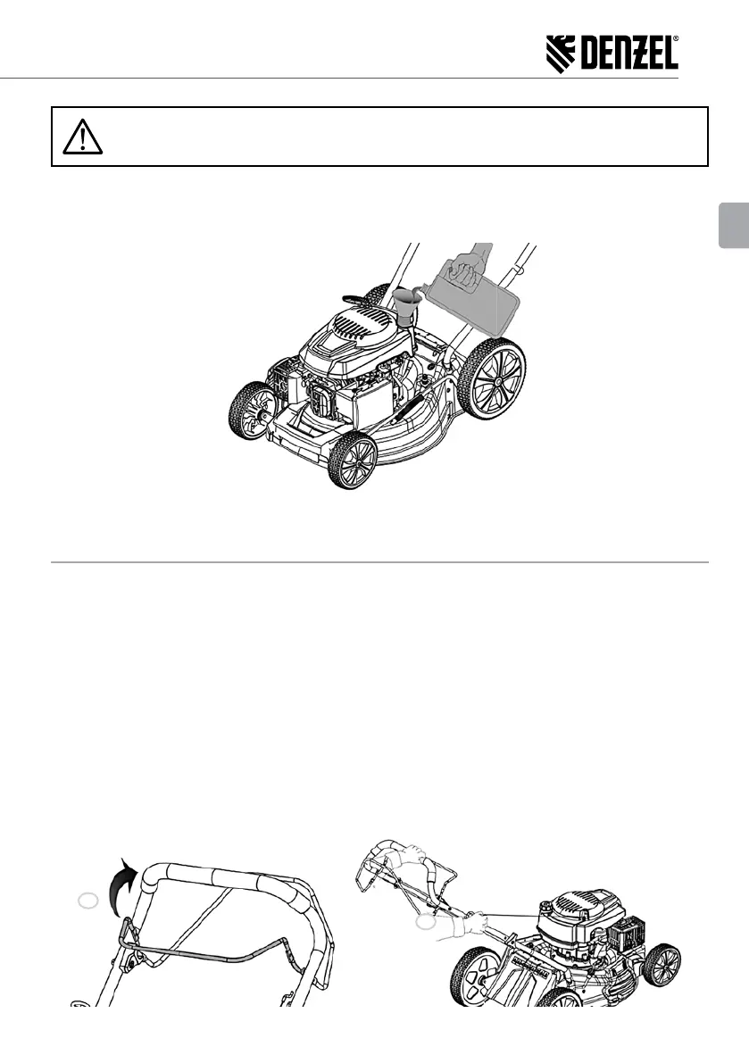 To refuel the lawn mower, unscrew the fuel tank lid, and carefully ll the tank via a funnel (Fig. 10). While