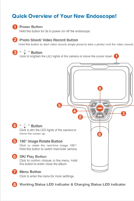 Depstech DS500 - Quick Overview of Your New Endoscope; Power Button Operation; Photo and Video Recording; LED Brightness and Cursor Control