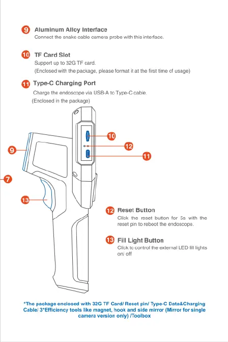 Depstech DS500 - Probe Connection and Charging Port; TF Card Slot Functionality; Reset and External Light Control