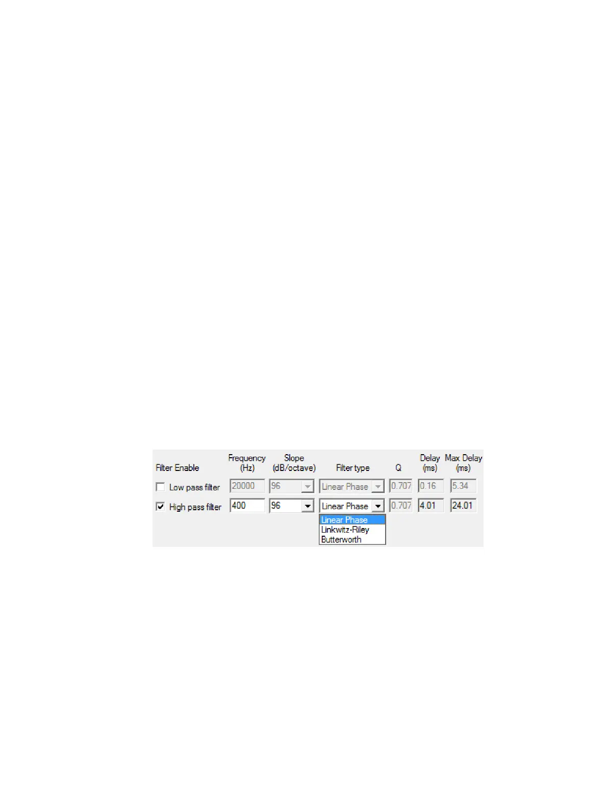 Enter the crossover frequency in the Frequency field, then drop down the Filter type