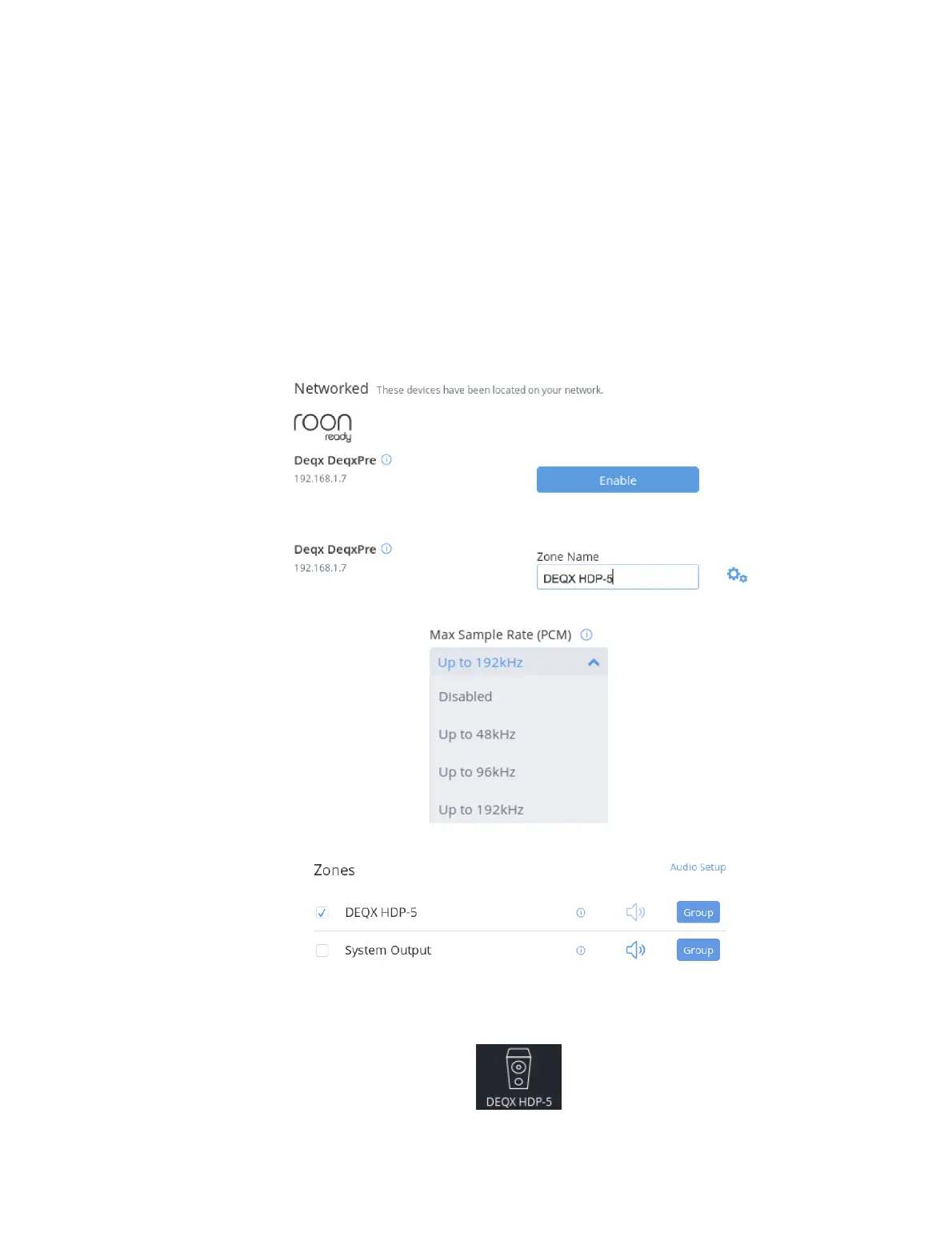 The DEQX HDP-5 and PreMATE+ are Roon Ready network players. To send audio from