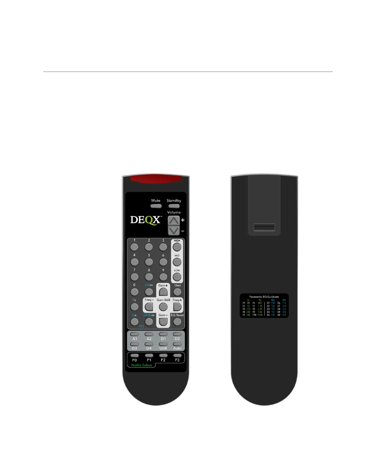 The DEQX Remote provides input and profile selection, mute and standby, and volume
