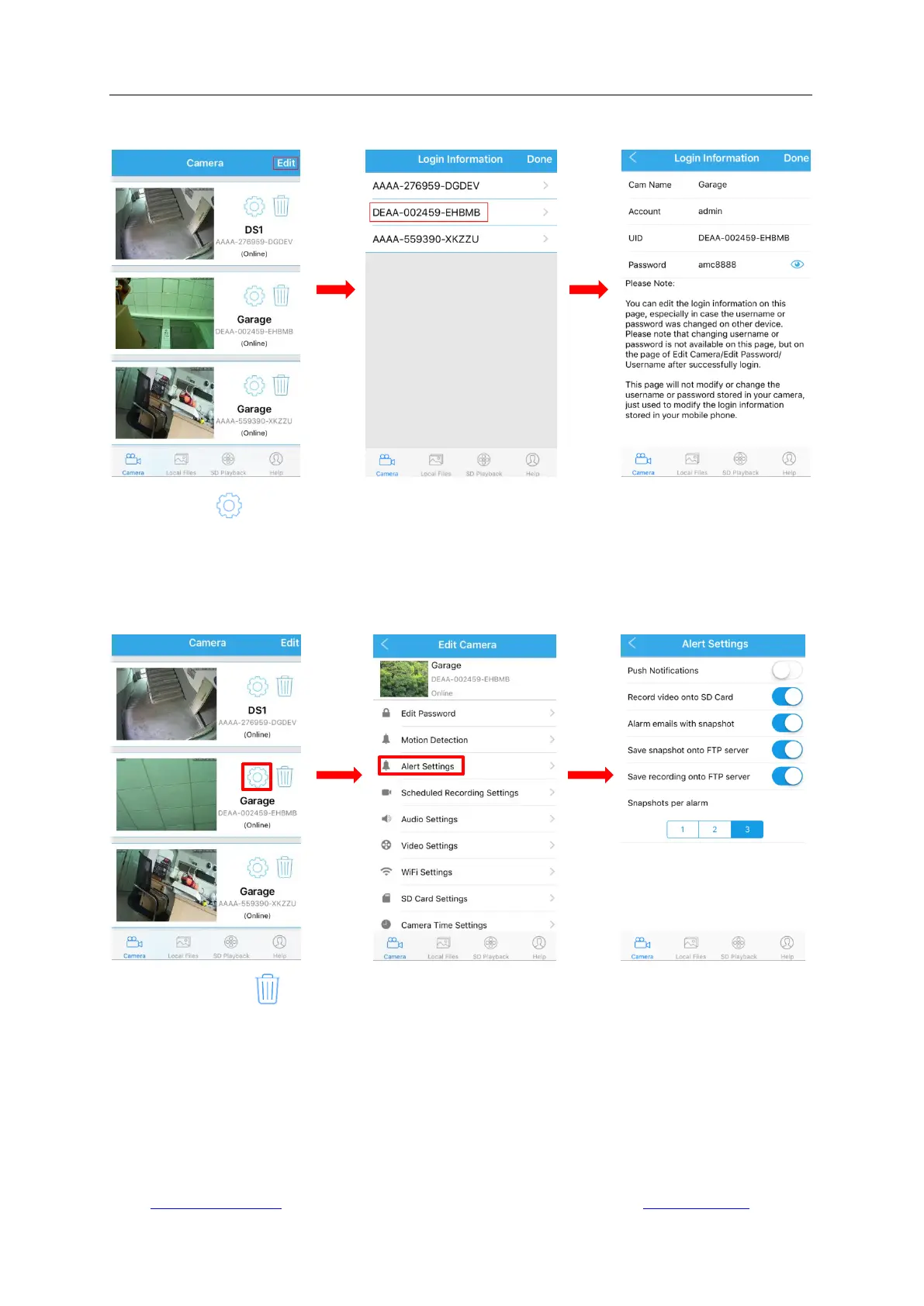 modify the camera name, username, password or UID code especially when you fail to login the