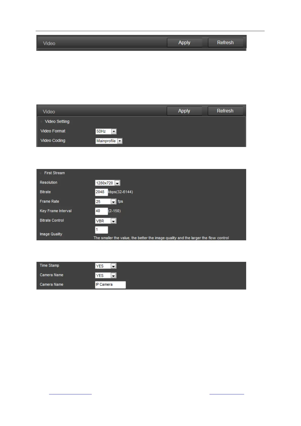 The parameter options below for the first/second stream affect the image/video quality, such as