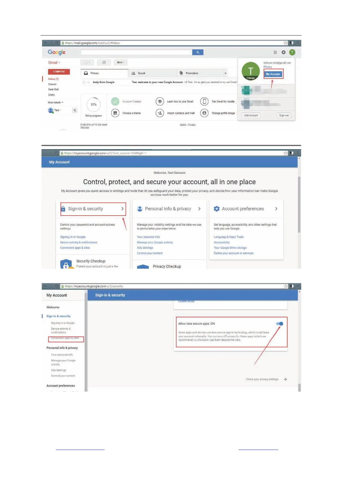 8) Go to “Connected apps & sites” and enable the button “Allow less secure apps On” at right.