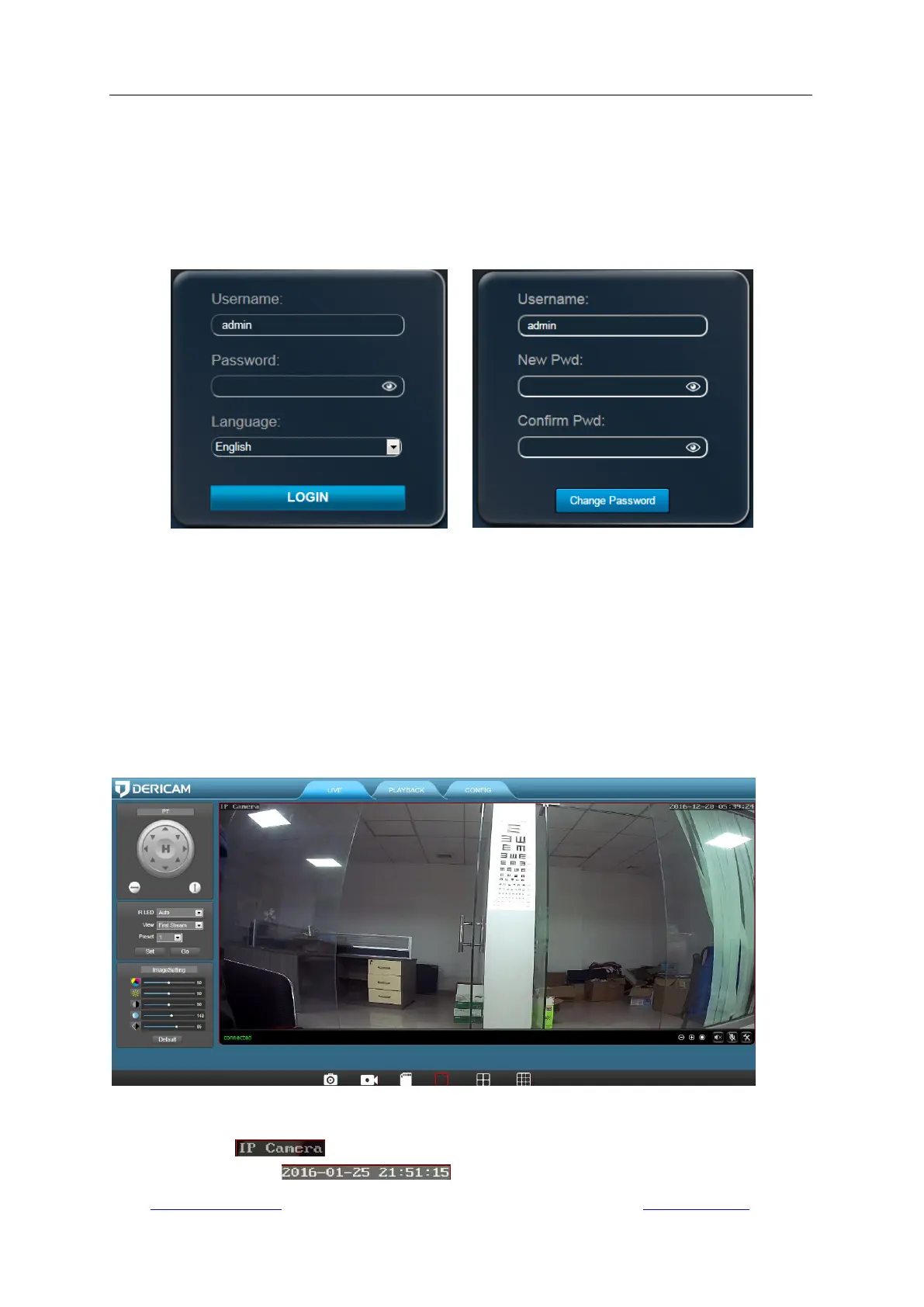 This section includes more details about Dericam camera’s user interfaces on web browser, as