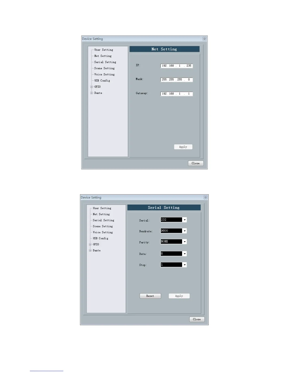 modify the current equipment serial port information; If you want to return to the default, just click "reset" button,