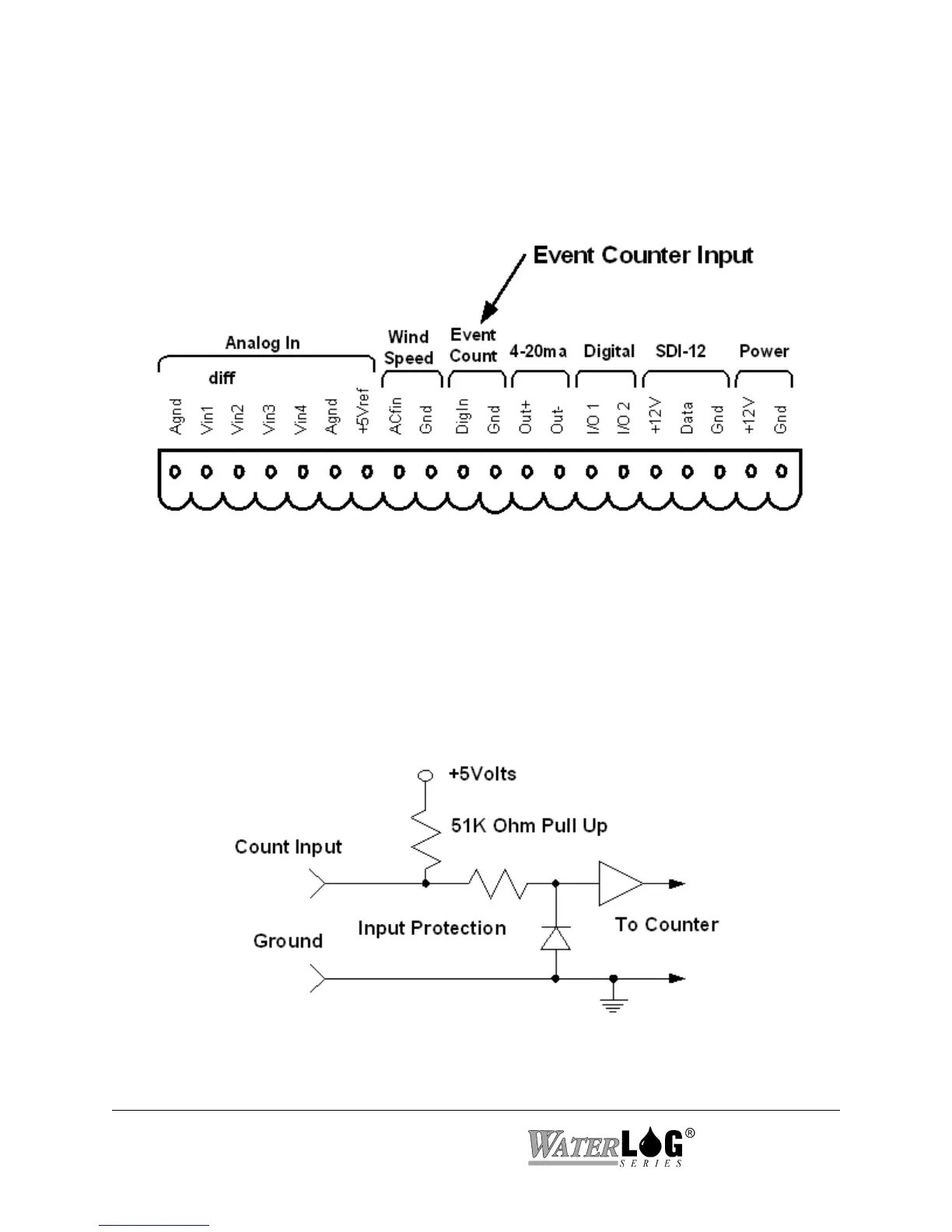 Pins 10 and 11 of the terminal block provide connection points for the digital event counter