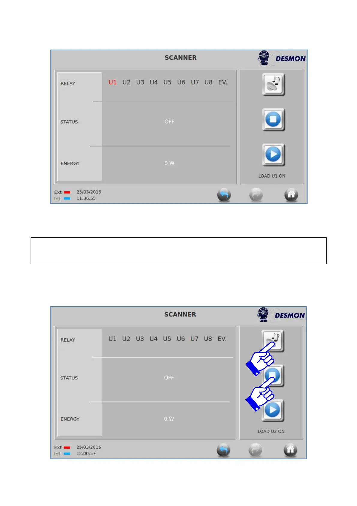 Press again the PLAY button to activate relay #2, or STOP to de-activate the relay. Press