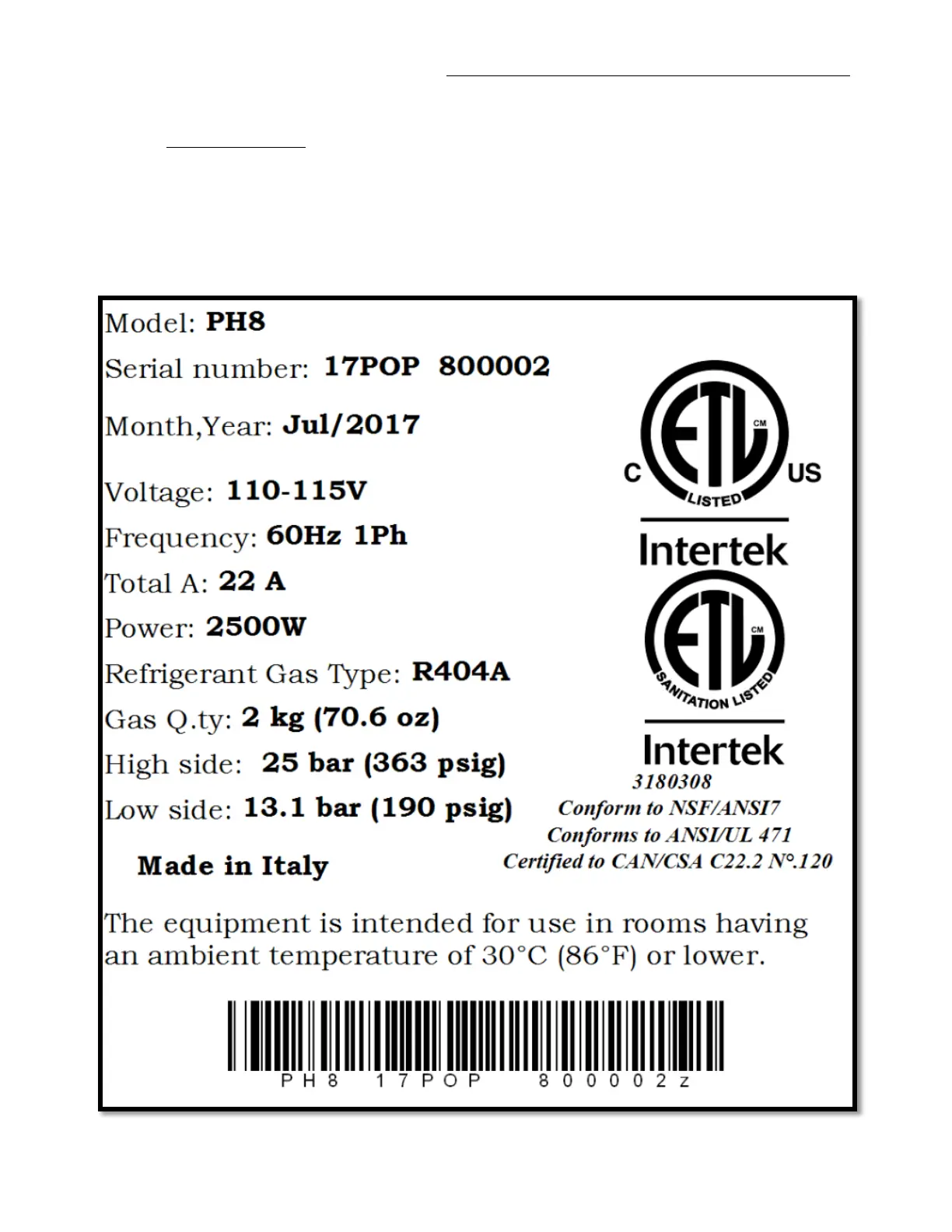 refrigeration data about the unit, such as the model, the serial number, year and month
