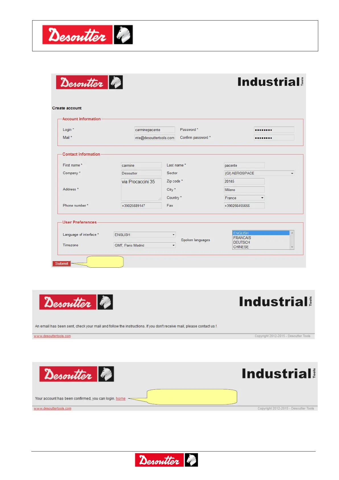 Enter the own information and click Submit. The following confirmation message is shown: