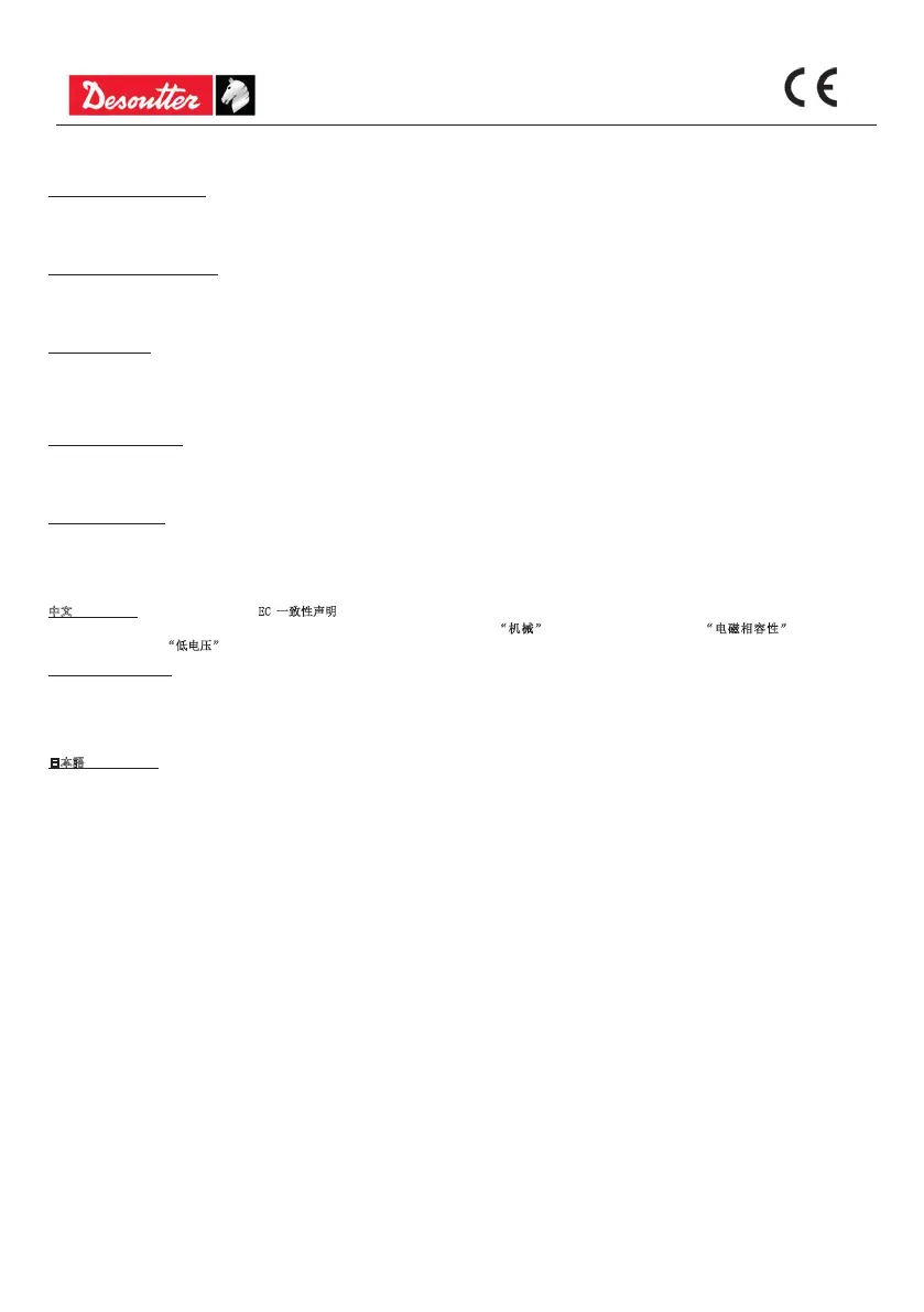 文 (CHINESE) (1) EC 一致性声明 - (2) 我们:DESOUTTER -(3) 技术参数资料可以从EU总部获得。 - (4) 声明其产品:螺丝刀- (5) 机器