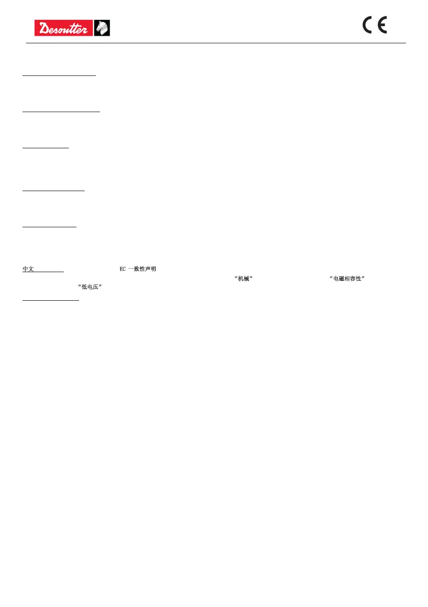 文 (CHINESE) (1) EC 一致性声明 - (2) 我们:DESOUTTER -(3) 技术参数资料可以从EU总部获得。 - (4) 声明其产品:螺丝刀- (5) 机