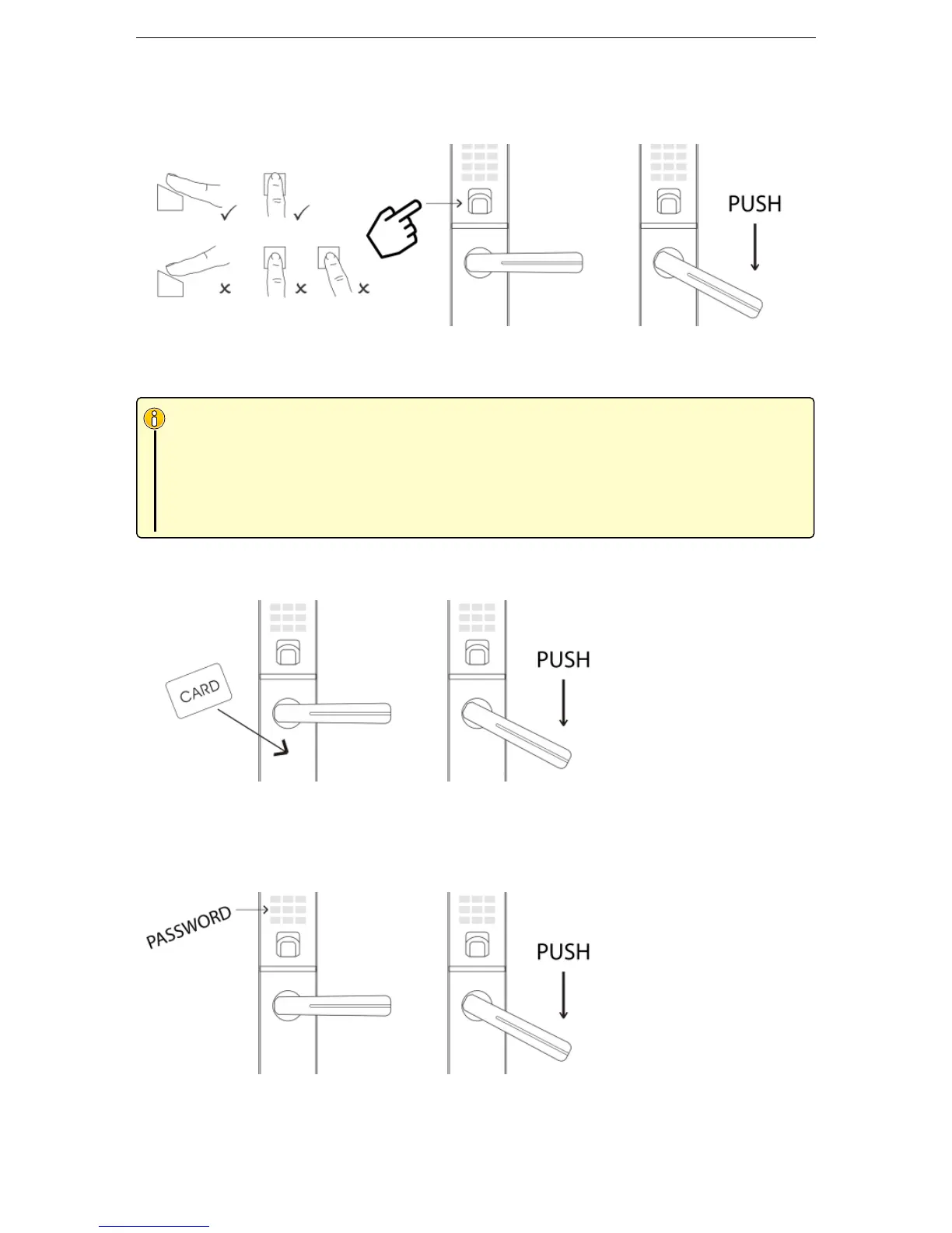 Scan card to unlock the door. Push the handle.