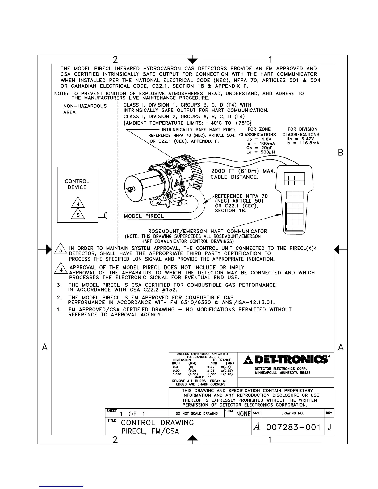 Det-Tronics PIRECL - Control Drawing; Control Drawing: FM;CSA Approval Overview; Control Drawing: Explosion Prevention Note; Control Drawing: Area Classification