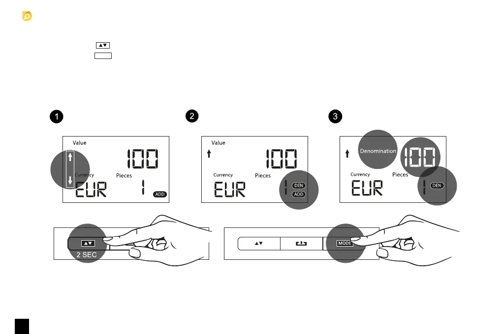 3. Modo denominación (DEN). La máquina mostrará la denominación del último billete comprobado.