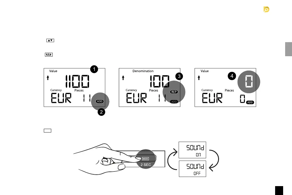 3. Pulse el botón para ver cada denominación contada. Se oirá un pitido doble cuando se muestren todos los resultados (n del