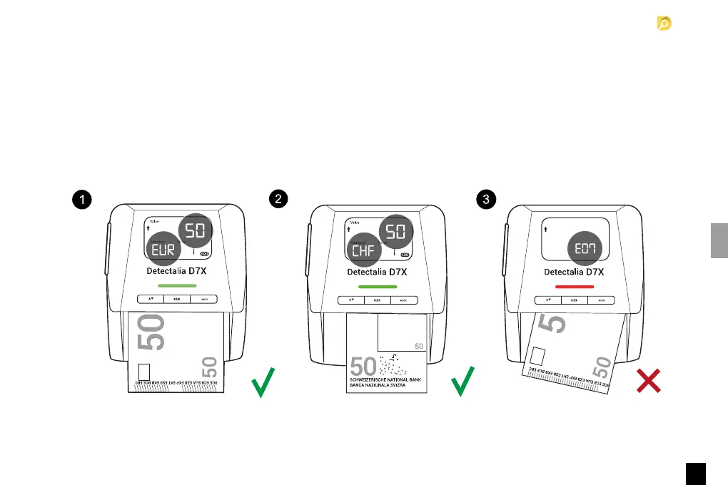3. Wenn eine verdächtige Banknote erkannt wird, blinkt die rote Leuchte und ein dreimaliger Piepton ist zu hören. Es wird ein Fehlercode