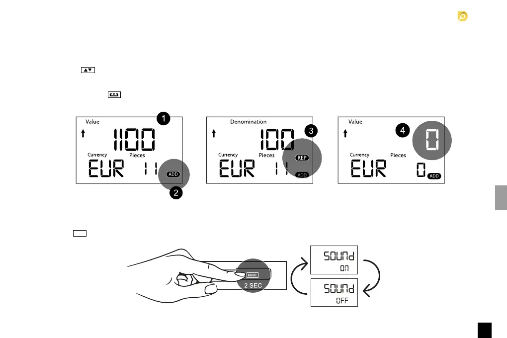 3. Prima o botão para ver cada uma das denominações contadas. Um som duplo é emitido quando todos os resultados são apresen-