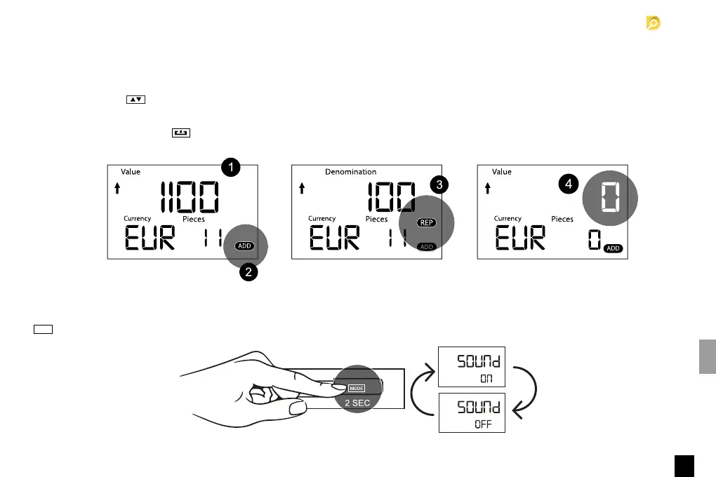 3. Druk op de knop om elk geteld biljet te bekijken. U hoort een dubbele pieptoon wanneer alle resultaten zijn weergegeven (einde