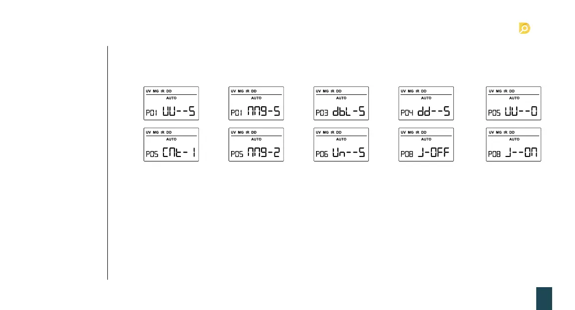 1. P01/UU--* Sensibilidad UV: 0 está desactivado, 9 es el más alto, el valor predeterminado es 5 (ref. imagen 6-1).