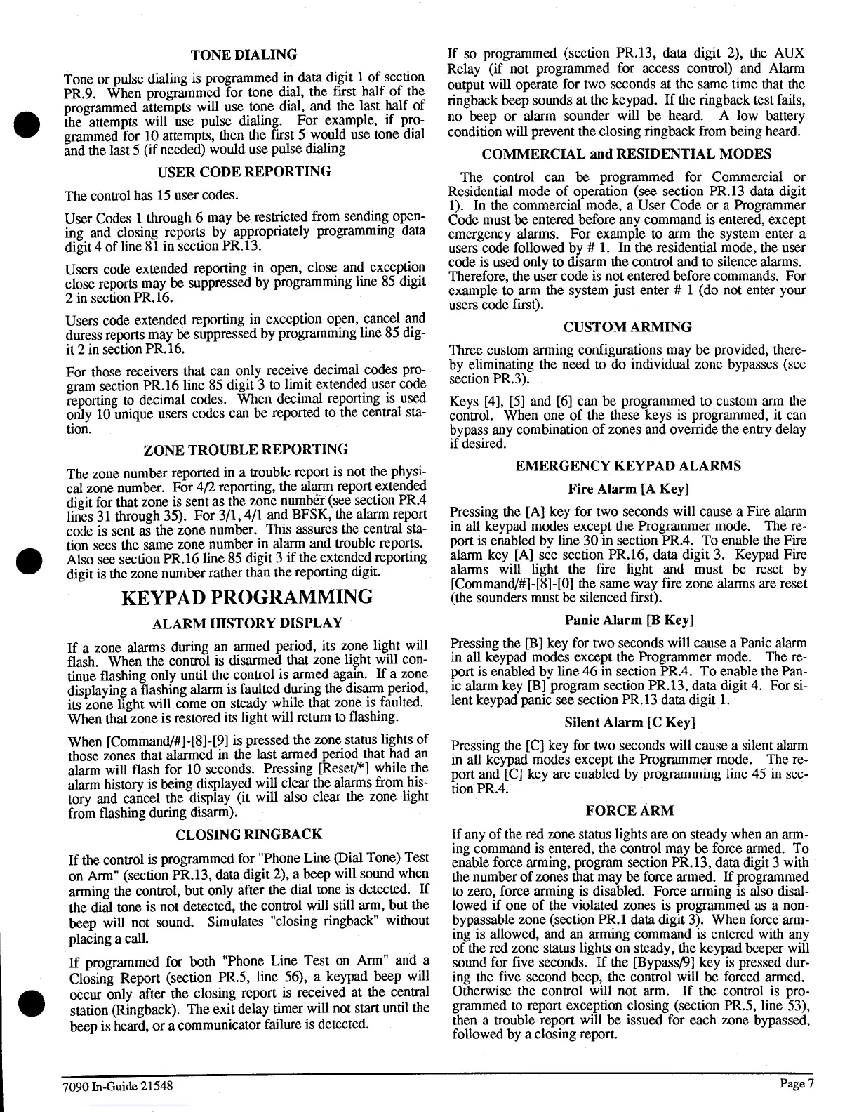 Detection Systems 7090 - Keypad Programming; User Code Reporting; Closing Ringback; Emergency Keypad Alarms