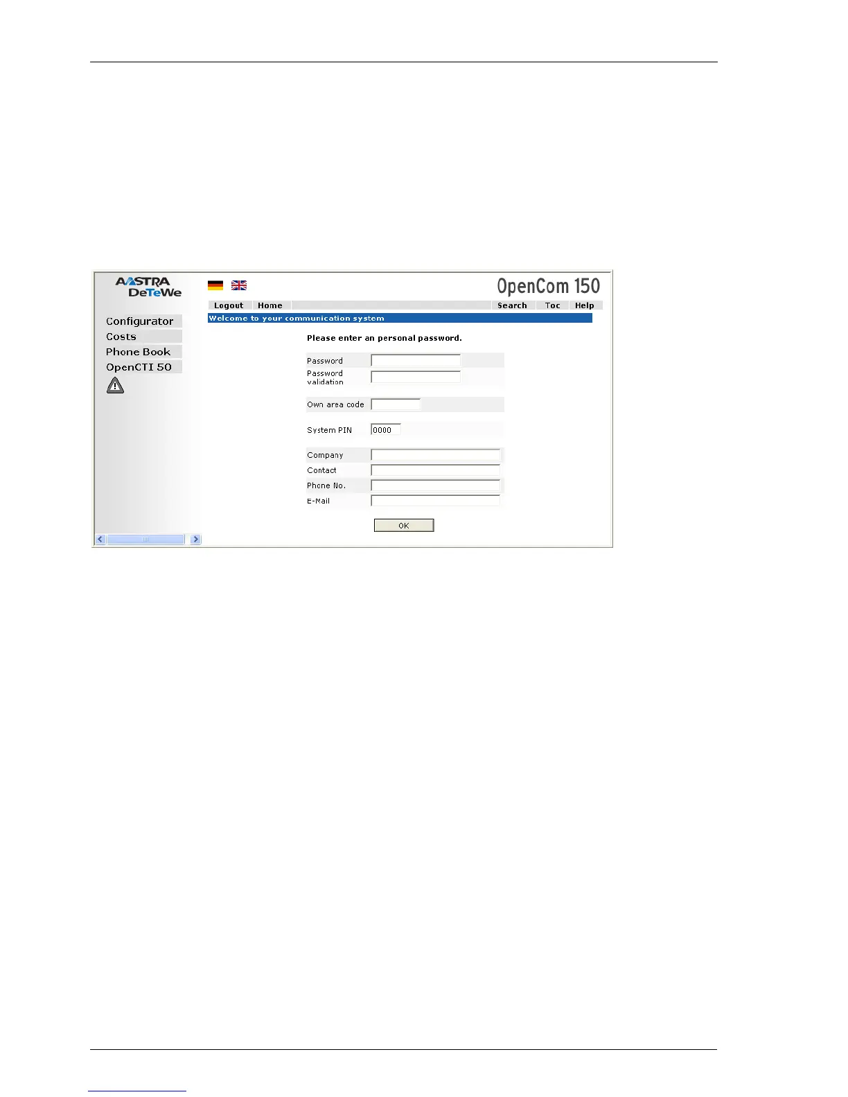 OpenCom 100 (this screenshot: OpenCom 150): dialogue box for initial access