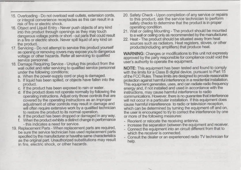 DETROLA KM837 - Overloading and Object;Liquid Entry; Servicing and Damage Requirements; Replacement Parts and Safety Checks; Mounting and Heat Source Avoidance