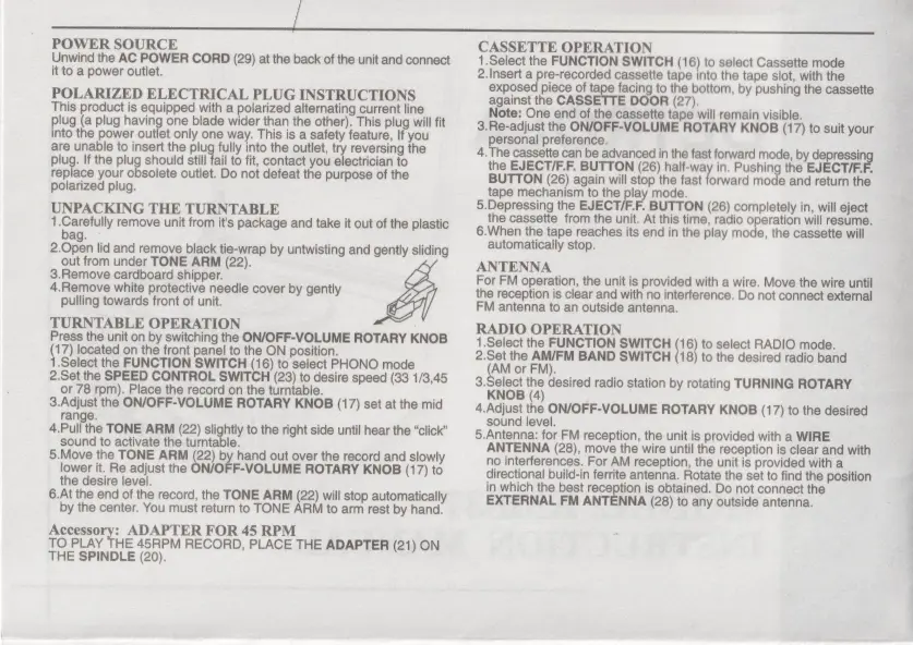 DETROLA KM837 - Product Operation Guide; Power Source and Plug; Turntable Setup and Operation; Cassette Operation
