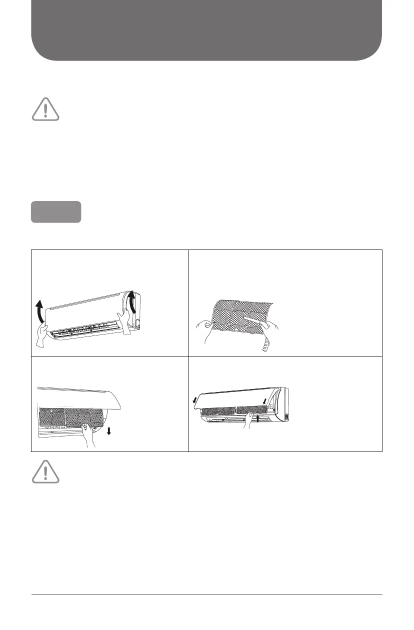 • After removing the filter, do not touch fins to avoid injury or damage the unit.